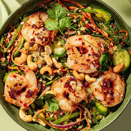 Fried scampi with cashew nuts, chilli pepper, garlic, parsley, onion, paprika, mango cubes, white wine and herb sauce and fresh salad.