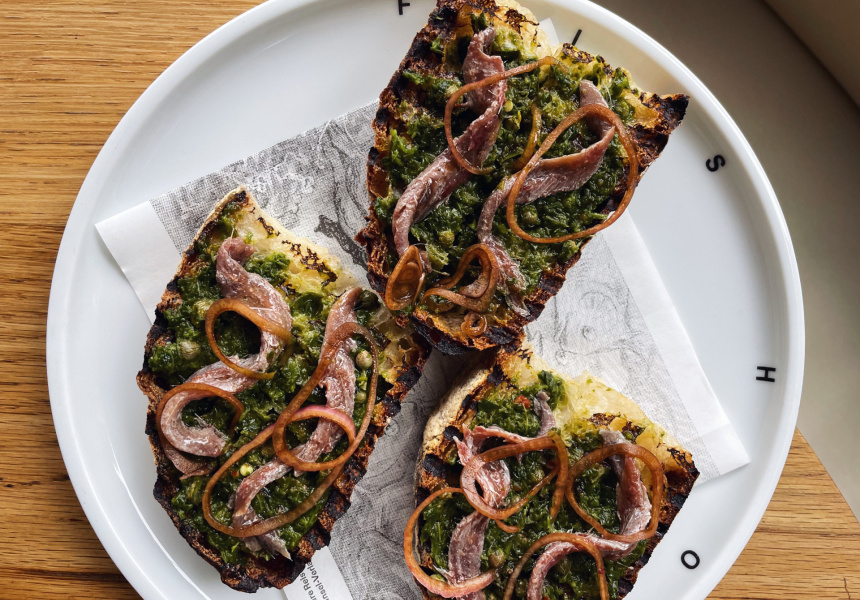 Toasted sourdough bread with pesto and fresh strips of anchovy straight from the fjord of Oslo